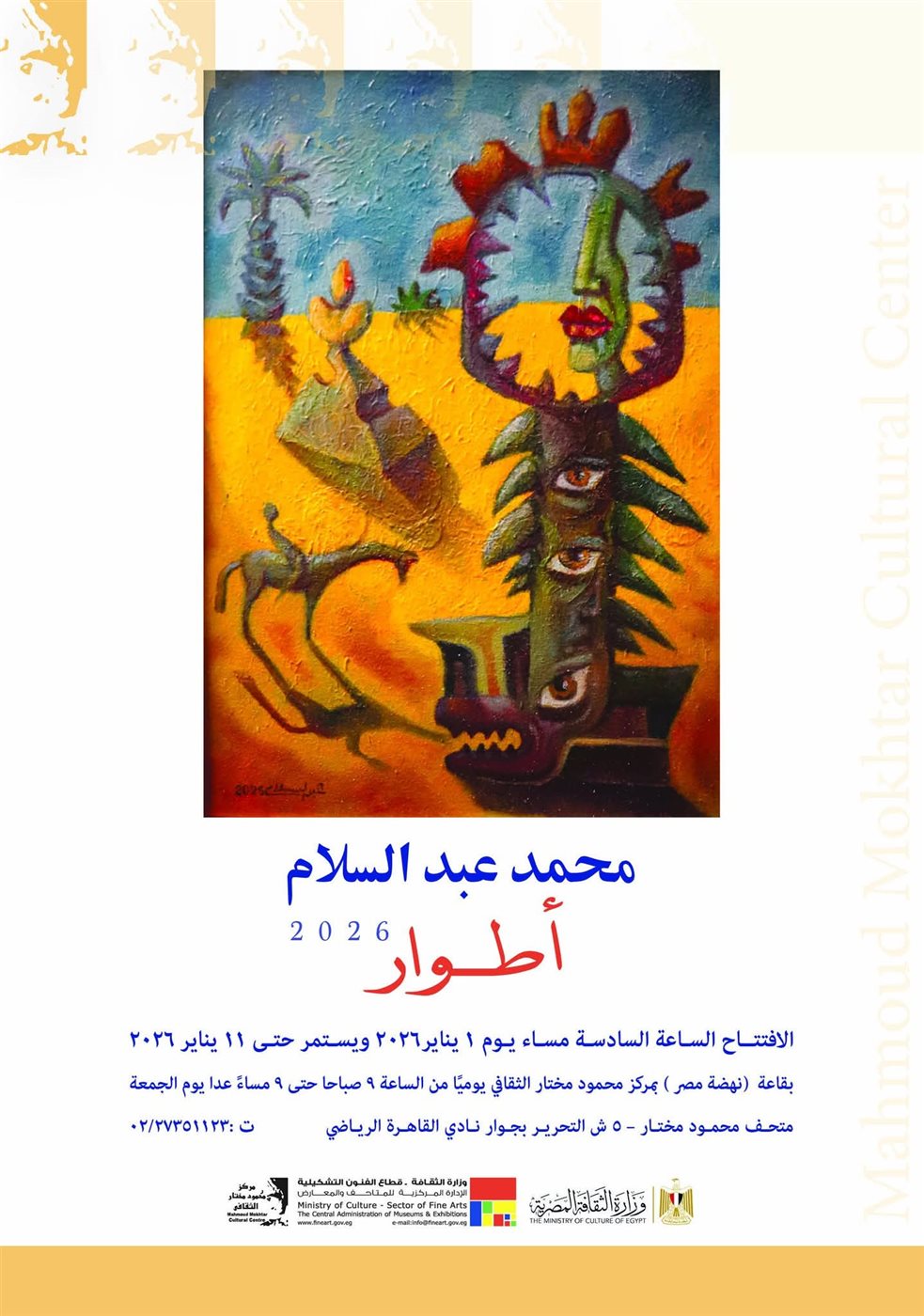 أعلن قطاع الفنون التشكيلية، برئاسة الدكتور وليد قانوش، عن افتتاح المعرض الفردي الجديد للفنان الدكتور محمد عبد السلام بعنوان “أطوار”، حيث سيتم الافتتاح في السادسة مساء يوم الخميس 1 يناير 2026، بقاعة “نهضة مصر” في مركز محمود مختار الثقافي بالجزيرة، والمعرض سيستمر حتى 11 يناير 2026، ومواعيد الزيارة ستكون من التاسعة صباحًا حتى التاسعة مساءً.