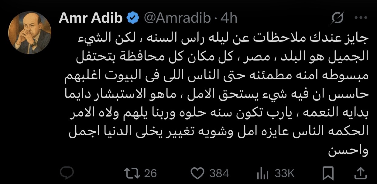 أعرب الإعلامي عمرو أديب عن تفاؤله بقدوم العام الجديد، حيث أشار إلى أن احتفالات ليلة رأس السنة في مختلف أنحاء مصر تعكس شعور الأمان والطمأنينة بين الناس، كتب عمرو أديب على حسابه في منصة إكس: “ممكن يكون عندك ملاحظات عن ليلة رأس السنة، لكن الشيء الجميل هو مصر، كل مكان وكل محافظة تحتفل بسعادة وأمان، حتى الناس اللي في البيوت أغلبهم حاسس إن فيه شيء يستحق الأمل، الاستبشار دائمًا بداية النعمة، يارب تكون سنة حلوة وربنا يلهم ولاة الأمر الحكمة، الناس محتاجة أمل وتغيير يجعل الدنيا أجمل”
