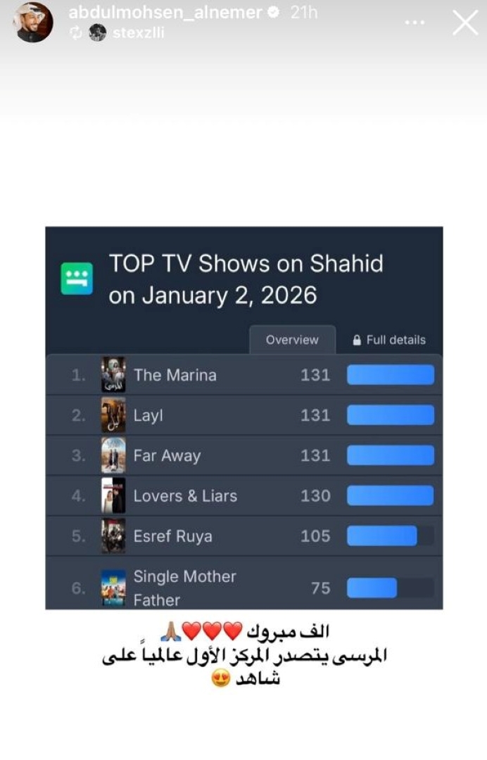 من خلال خاصية القصص على إنستغرام، أعلن الفنان عبد المحسن النمر أن مسلسل “المرسى” تصدر المركز الأول عالمياً، ونشر بوستر للعمل مع تعليق يقول فيه: “ألف مبروك؛ المرسى يتصدر المركز الأول عالمياً على شاهد”، وقد حقق المسلسل نسبة مشاهدة مرتفعة منذ عرض حلقاته الأولى