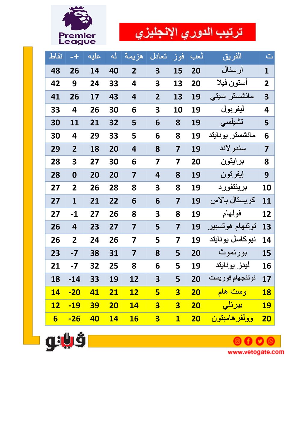 ترتيب الدوري الإنجليزي قبل ختام الجولة الـ 20