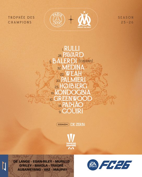 أما مارسيليا، فتكونت تشكيلته من: جيرونيمو رولي في حراسة المرمى، بينجامين بافارد، بيلاردي، فاكوندو ميدينا في الدفاع، تيموثي وياه، بيير إيميل هويبيرج، جيفري كوندوغبيا، إيمرسون في الوسط، وماسون جرينوود، جويري، وإيجور بايكساو في الهجوم