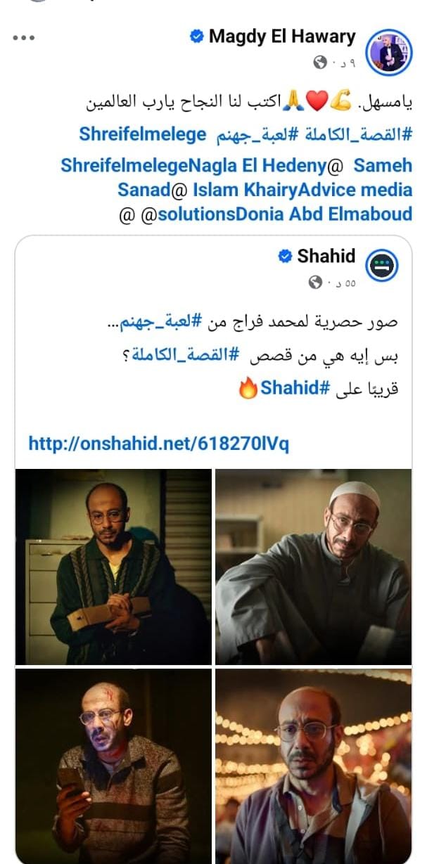 المخرج مجدي الهواري شارك الصور الأولى من كواليس تحضيرات أول حكاية من المسلسل، وهي “لعبة جهنم”، والتي ستعرض على منصة “شاهد”. وقد أعاد نشر مجموعة من الصور التي التقطت خلال التصوير، وعلق عليها قائلاً “يامسهل.. اكتب لنا النجاح يارب العالمين القصة الكاملة لعبة جهنم”.
