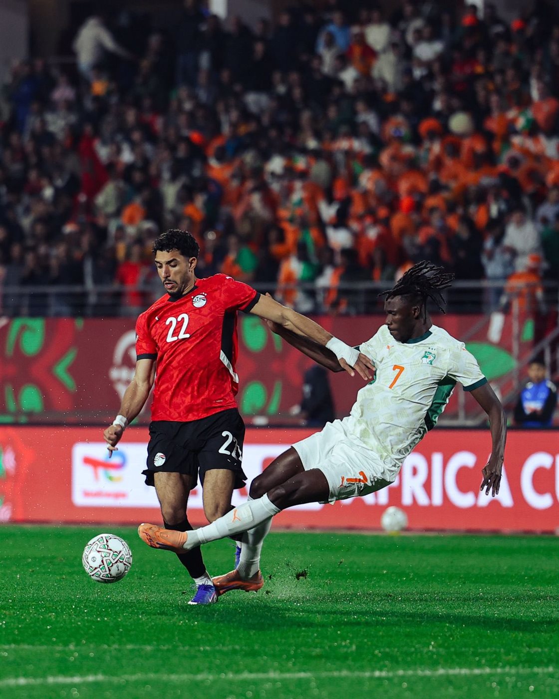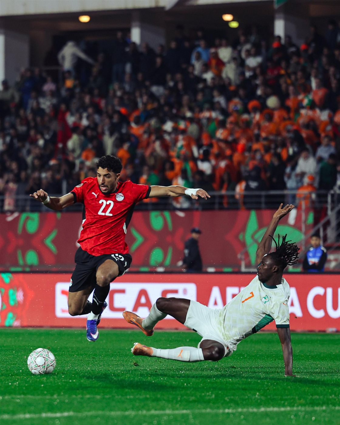 تقدم منتخب مصر على كوت ديفوار 2-1 في الشوط الأول من المباراة التي تُجرى مساء اليوم السبت على ملعب أدرار في مدينة أغادير، وذلك ضمن ربع نهائي كأس أمم أفريقيا 2025. سجل أهداف منتخب مصر عمر مرموش في الدقيقة الرابعة ورامي ربيعة في الدقيقة الثانية والثلاثين، بينما جاء هدف كوت ديفوار بالخطأ من أحمد فتوح في الدقيقة الأربعين.