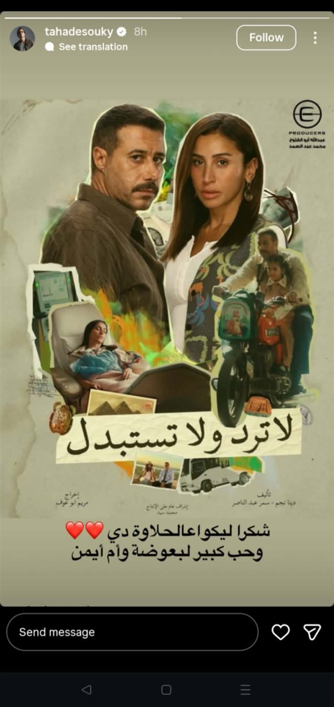 أشاد الفنان طه دسوقي بأبطال مسلسل “لا ترد ولا تستبدل” الذي تم عرضه مؤخرًا على منصة Watch It، حيث نشر صورة للبوستر الرسمي للمسلسل عبر خاصية الأستوري على صفحته في انستجرام، وكتب: “شكرا ليكوا على الحلاوة دي، وحب كبير لبعوضة وأم أيمن”، وفي رد على ذلك، قام الفنان أحمد صلاح السعدني بمشاركة الأستوري وعلق قائلاً: “طه الحقيقي”، وذلك في إشارة إلى اسم الشخصية التي يجسدها طه في العمل.