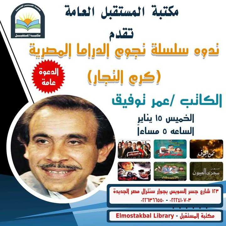 تنظم مكتبة المستقبل ندوة تتناول أعمال الكاتب والسيناريست كرم النجار، وذلك يوم الخميس، 15 يناير، في الساعة الخامسة مساءً، حيث يدير النقاش الناقد والكاتب عمر توفيق، تحت رعاية الدكتورة سهام الجوهرى، رئيس مجلس إدارة جمعية مصر الجديدة.