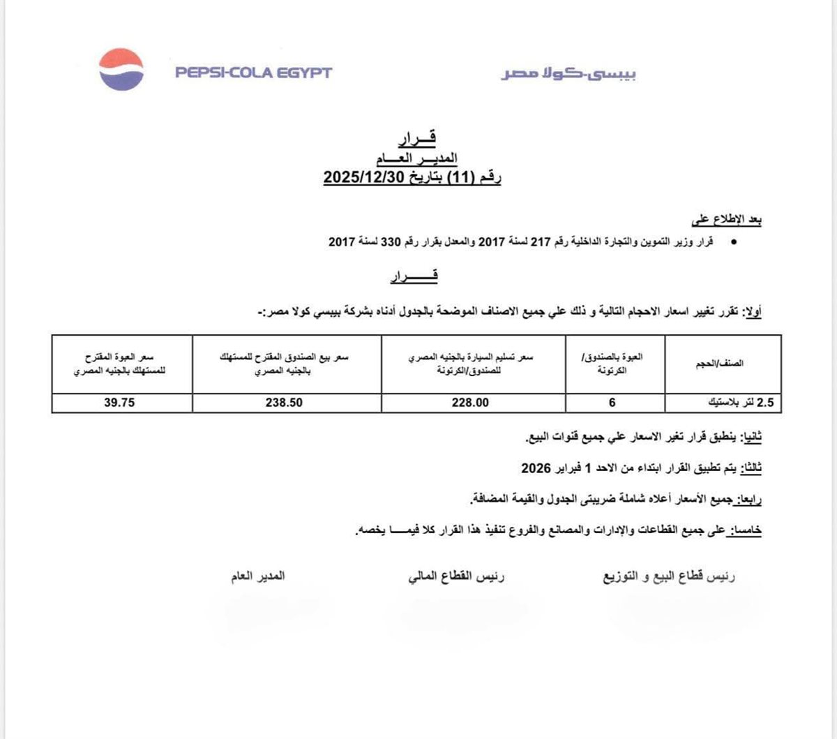 أكد حازم المنوفي، عضو شعبة المواد الغذائية بالغرف التجارية، أن شركة بيبسي كولا مصر أرسلت خطابًا للتجار والموردين بشأن رفع أسعار مشروبات بيبسي في عبوات البلاستيك.