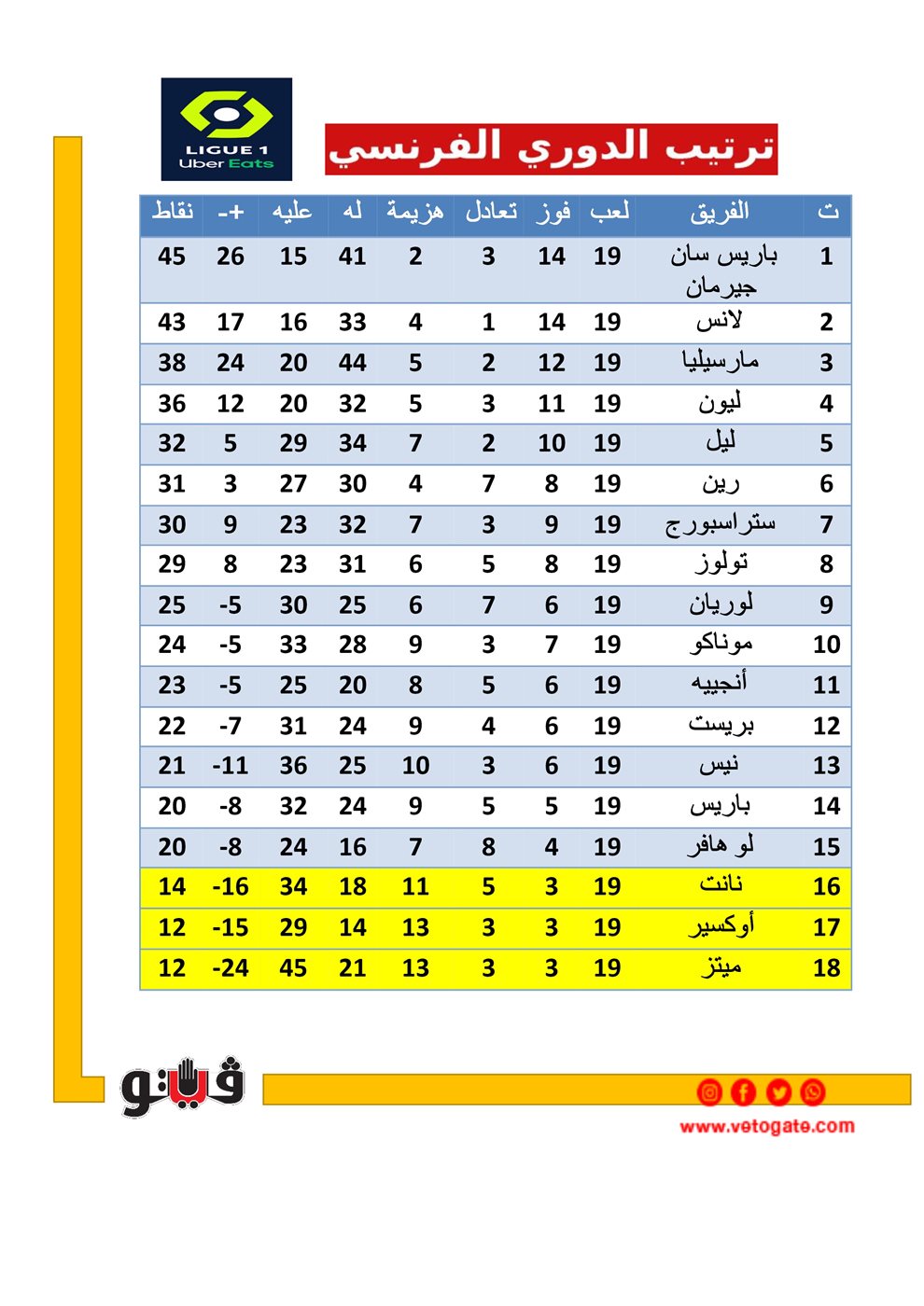 ترتيب الدوري الفرنسي بعد الجولة الـ 19